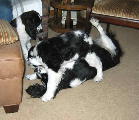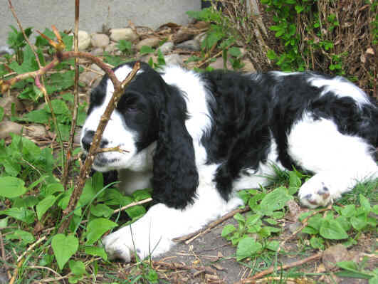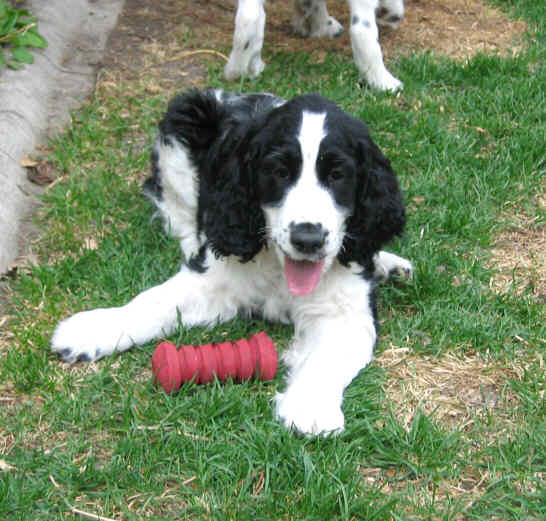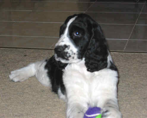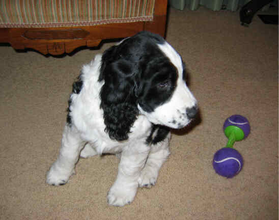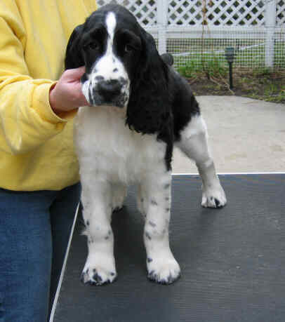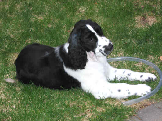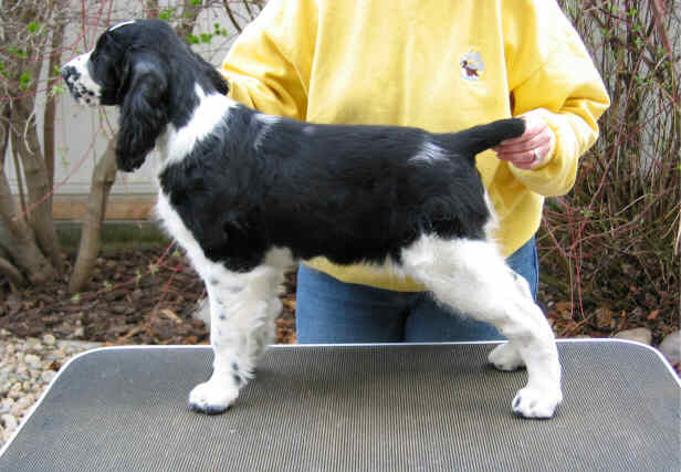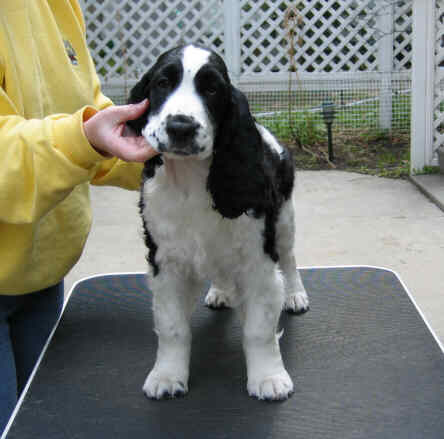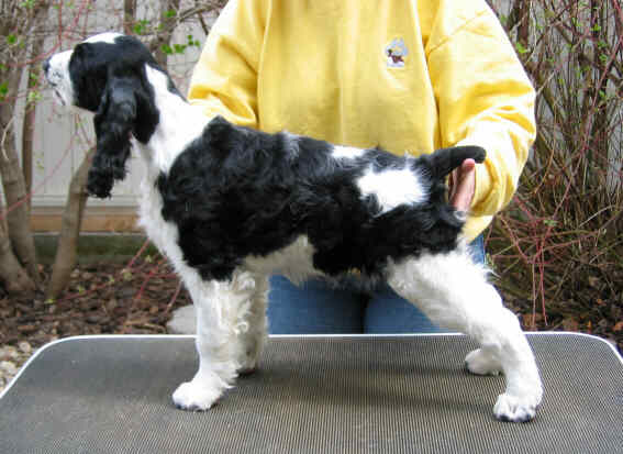 | Sire: Am Ch Hillcrest Namtn Kocrk Canvas OA, AXJ "Canvas" (Am Ch Hillcrest Just Hale 'N Hardy VCD1, OA, SH, WDX ex Landgons Hillcrest Daisy); OFA Good, Elbows Normal, CERF, PFK clear; B/W; whelped August 4, 1999 | |