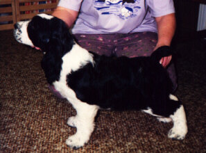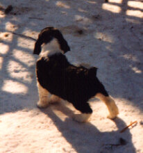 Dam: "Cally", Ch Cascadian Caliner de Bondir CD, AGN, ADC, NAC, NJC, TT (Am Ch Donahan's Documentary CDX ex Am Ch Cascadian's Crystal Conexion CD, JH); OFA, CERF, Thyroid & Von Willebrand Normal, B/W; whelped May 6, 1994 | |